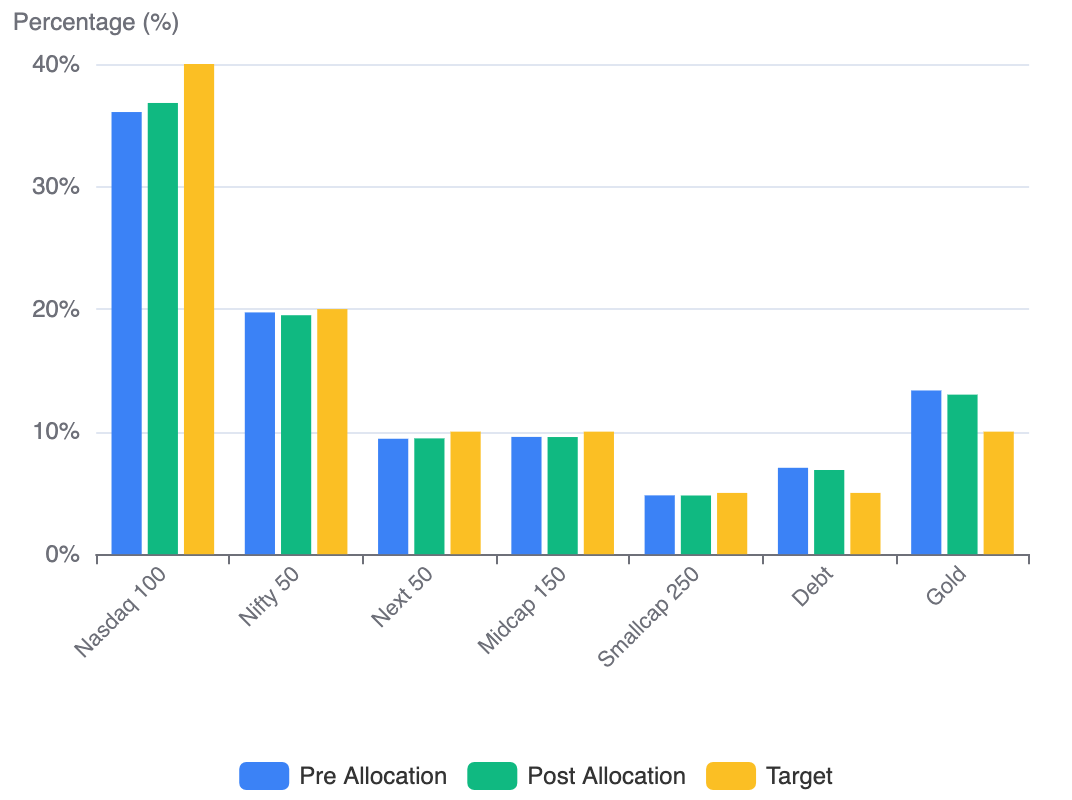 - Gold and Debt receive zero — both are overweight relative to their TY 2026-27 targets. By not buying them they drift towards the target allocation